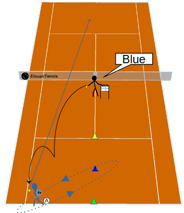 The coach announces the color of the cone that the player must go around before hitting the next ball with a backhand.