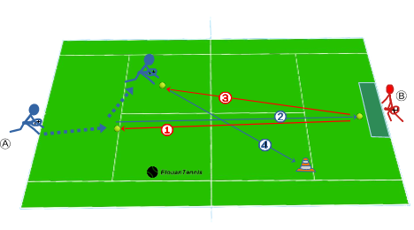 - Player A finishes the point with a short volley and crosses to the backhand side.
